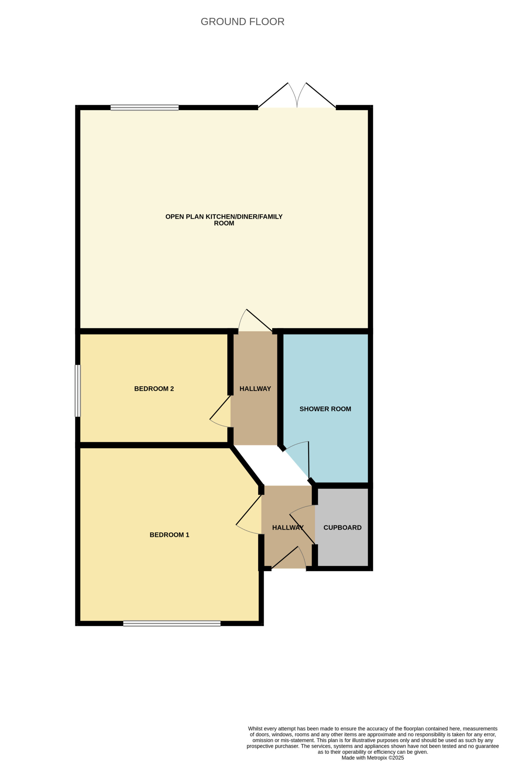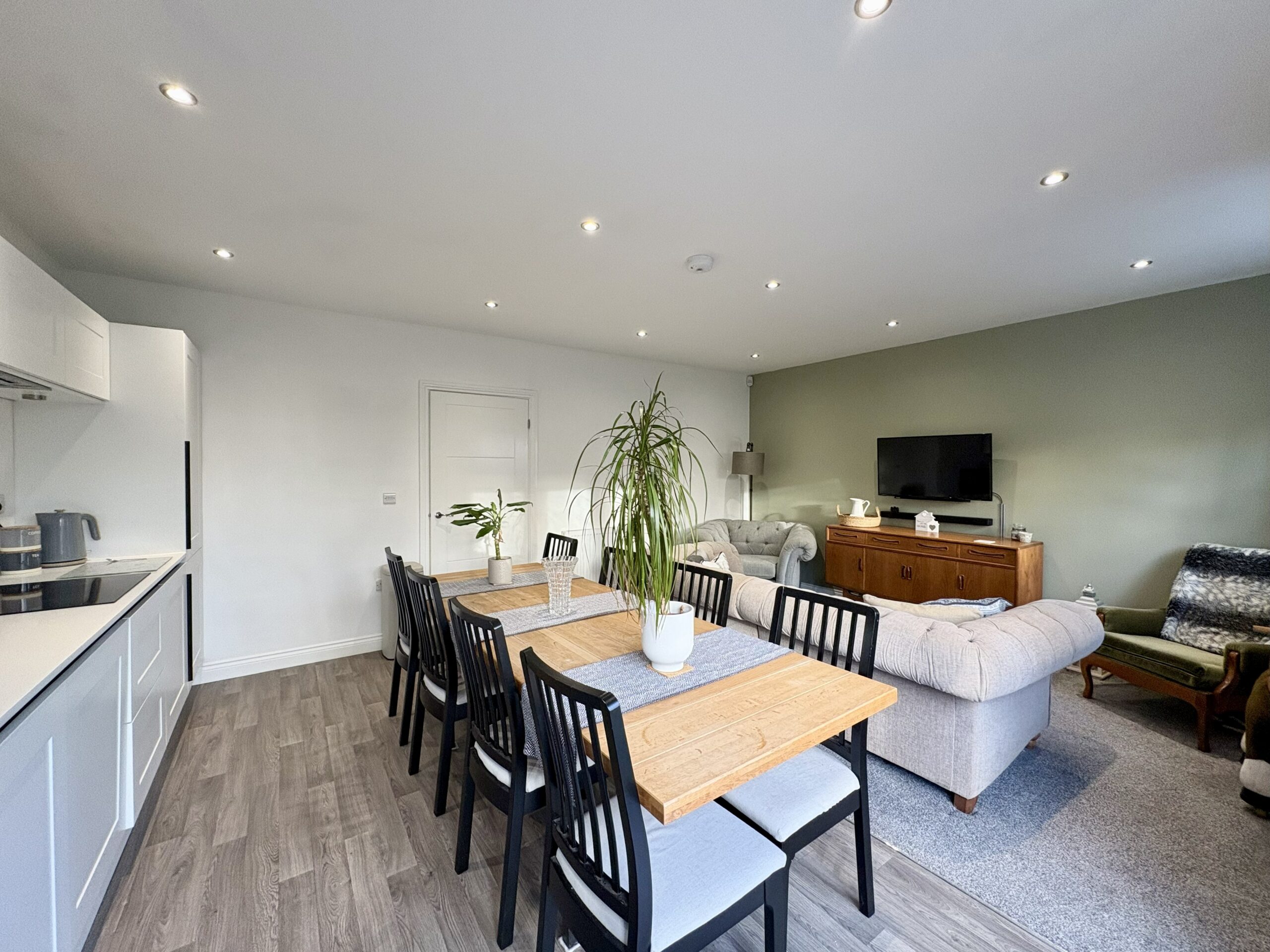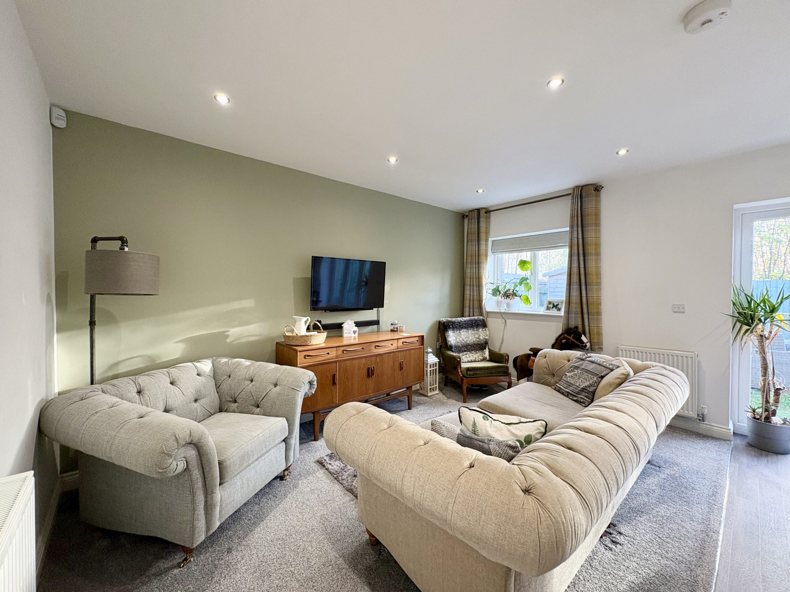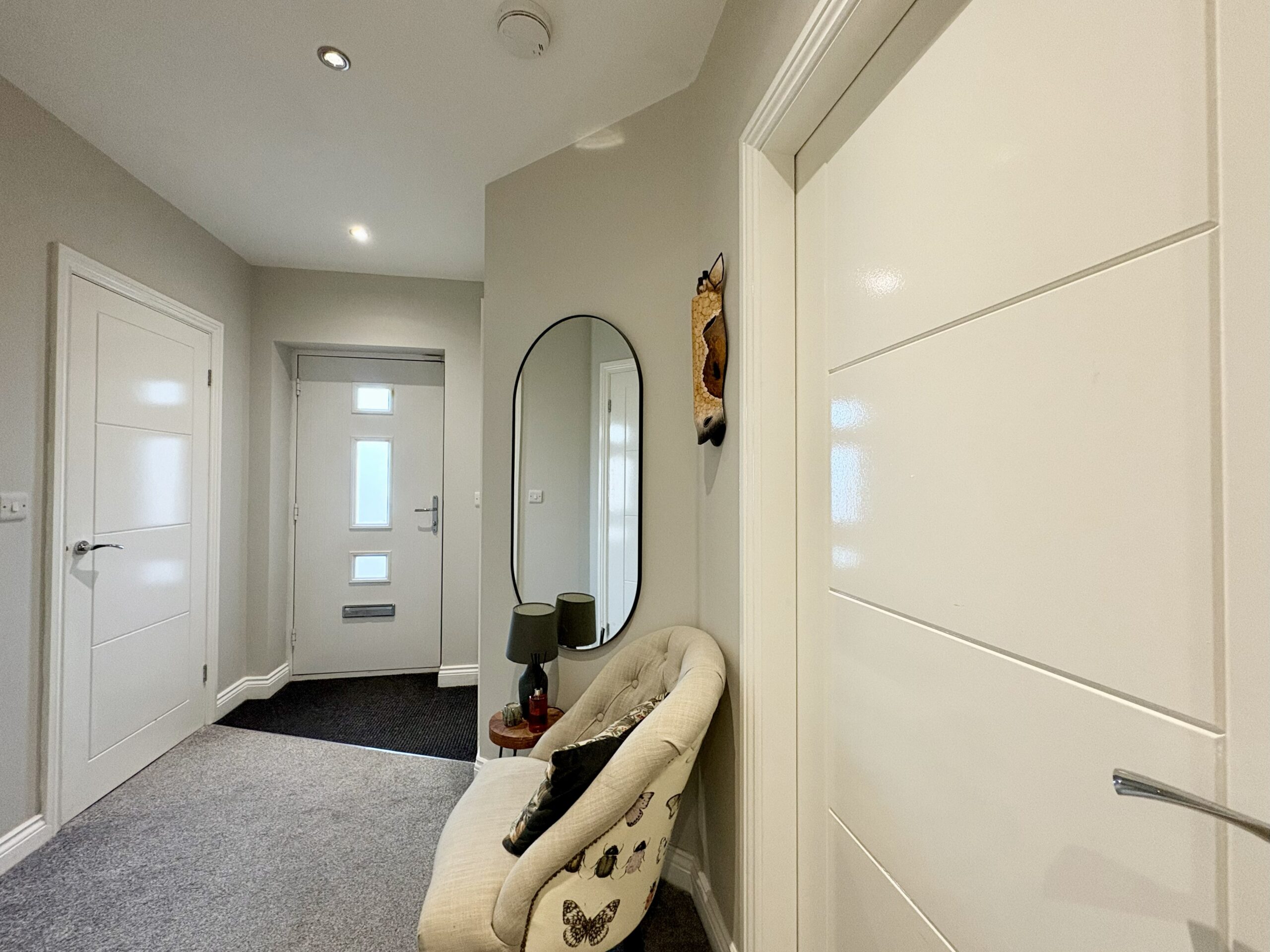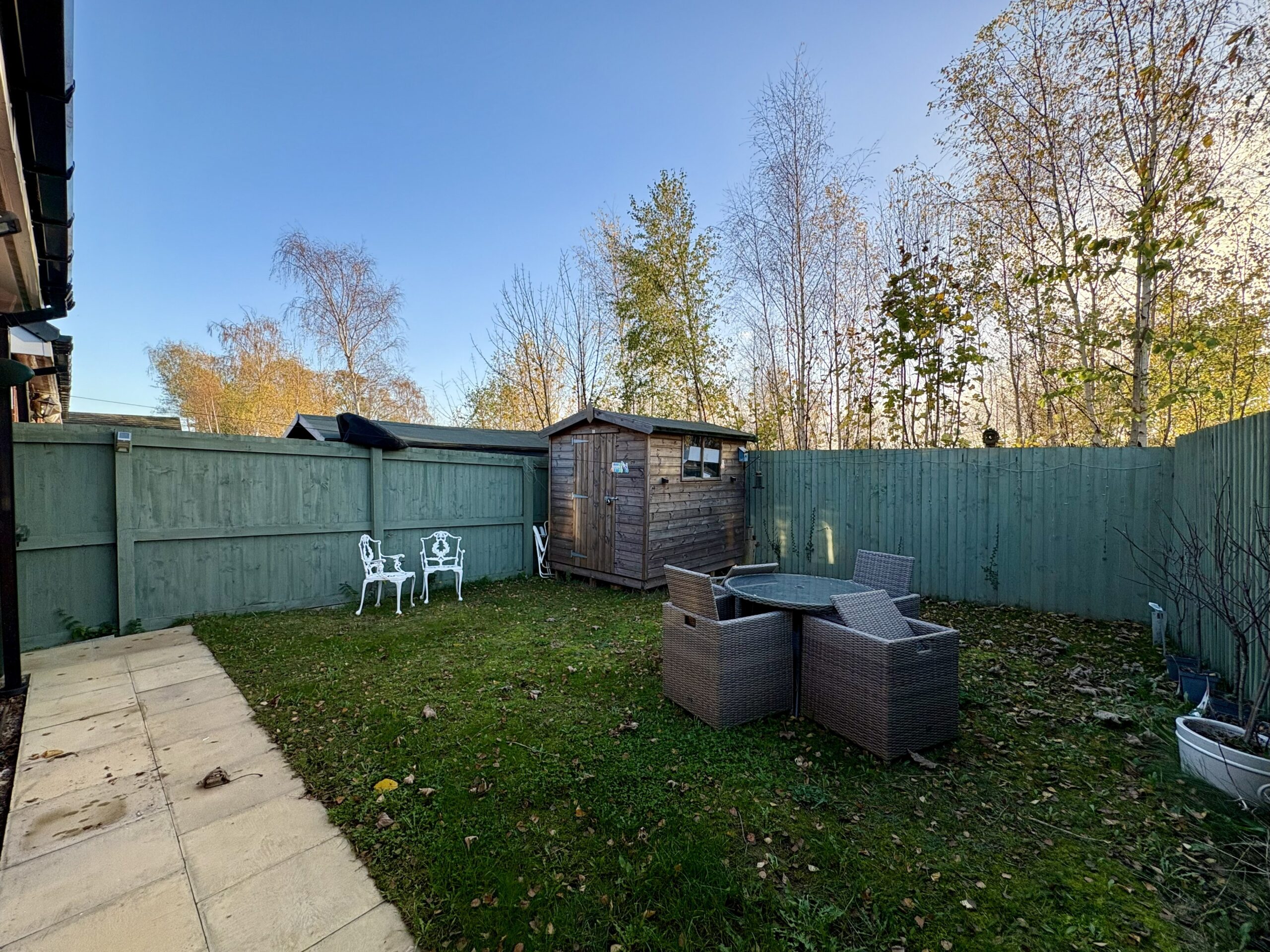 The principal bedroom is a generous double with pleasant views over the front garden and features fitted wardrobes and carpet. The second bedroom, positioned to the side, is currently used flexibly as a guest room or home office and also includes carpet and radiator. A stunning, contemporary shower room serves the home, fitted with a walk-in shower, WC, wash basin, heated towel rail, spot lighting, and full wall and floor tiling for a clean, modern finish.