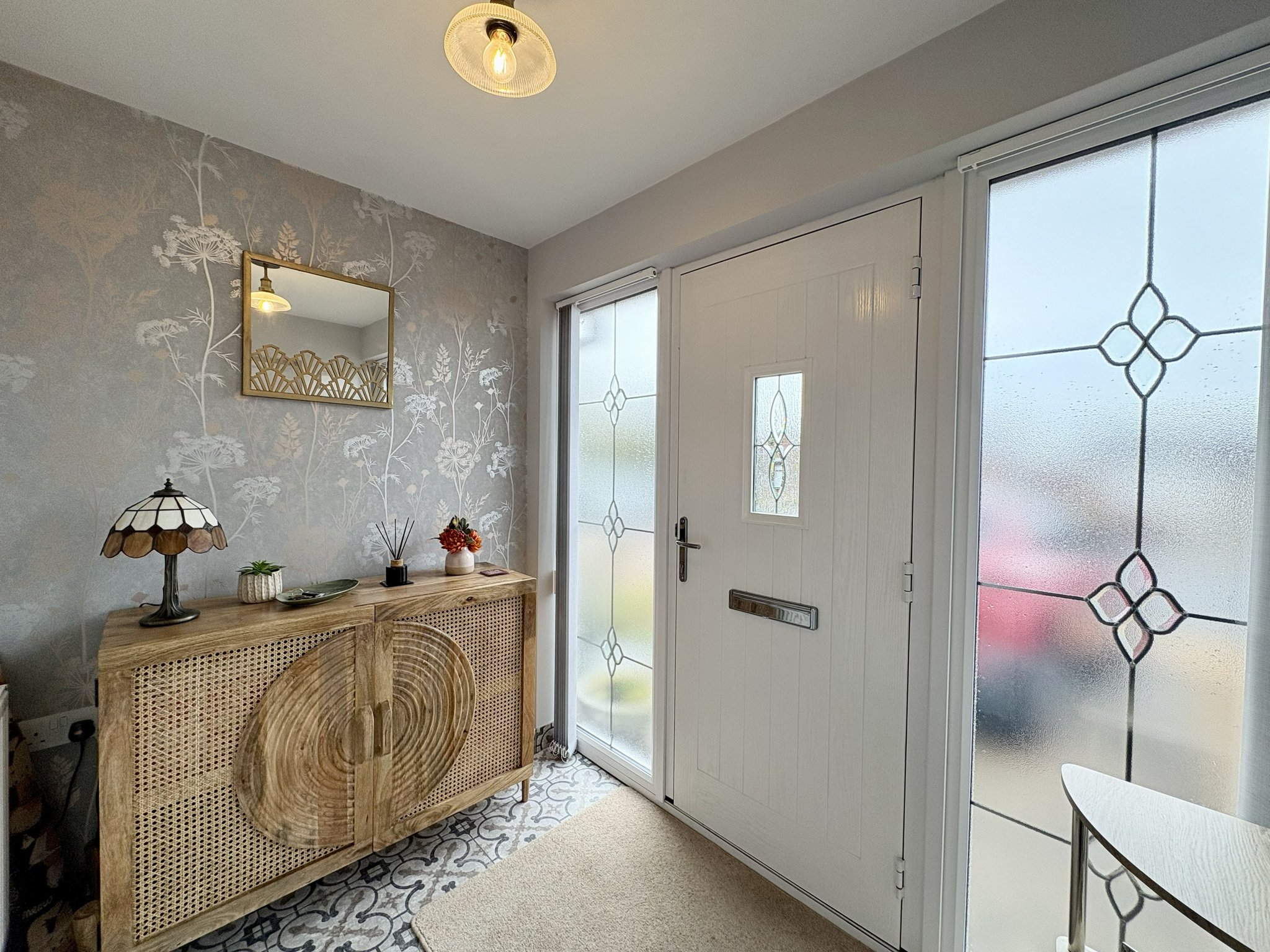 Upon entering, you’re welcomed into a bright and airy entrance hallway, where glass panels to either side of the front door flood the space with natural light. This area provides practical storage for coats and shoes, with internal access to the main living space and utility/storage room. The floor is tiled and there is a single pendant light fitting and radiator.