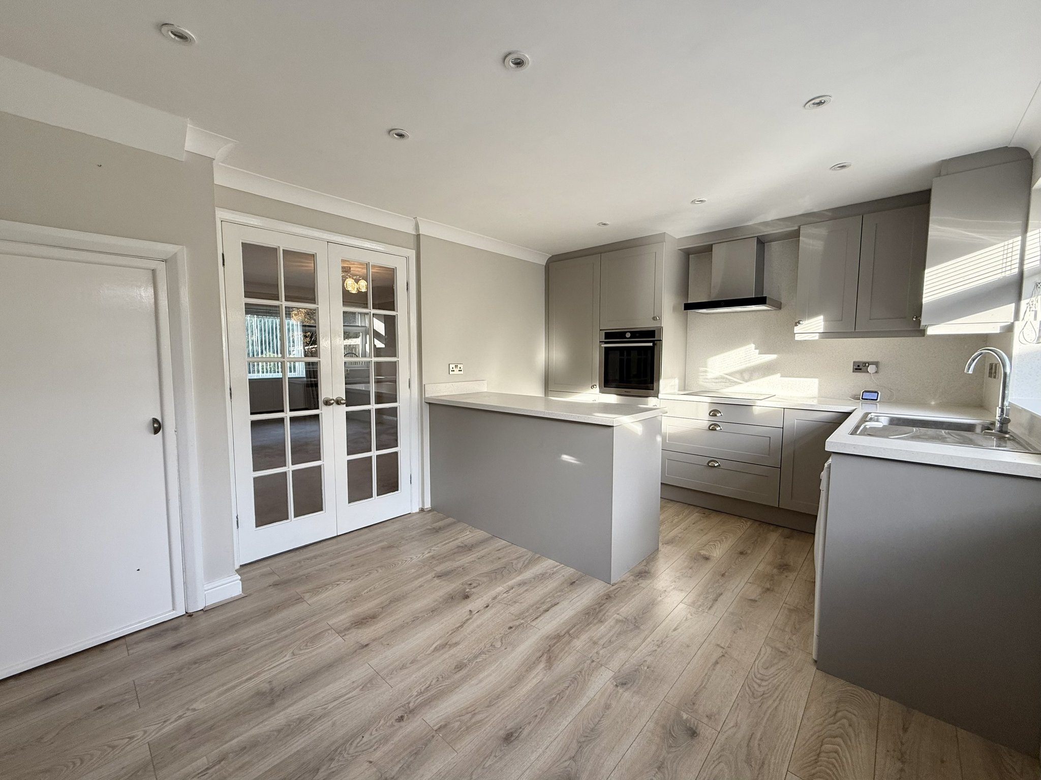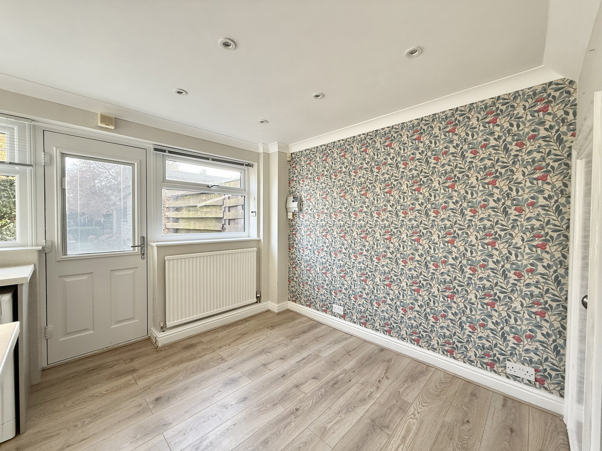 To the rear of the property is a modern open-plan kitchen and dining area, ideal for family life and entertaining. The kitchen is fitted with contemporary shaker-style wall and base units, complemented by a central breakfast bar. Integrated appliances include an electric oven, gas hob, dishwasher and fridge/freezer, with plumbing available for a washing machine. Rear-aspect windows and a door provide direct access to the garden, creating a seamless indoor-outdoor living space. Additional features include spot lighting, laminate wood-effect flooring, a radiator and a useful understairs storage cupboard.