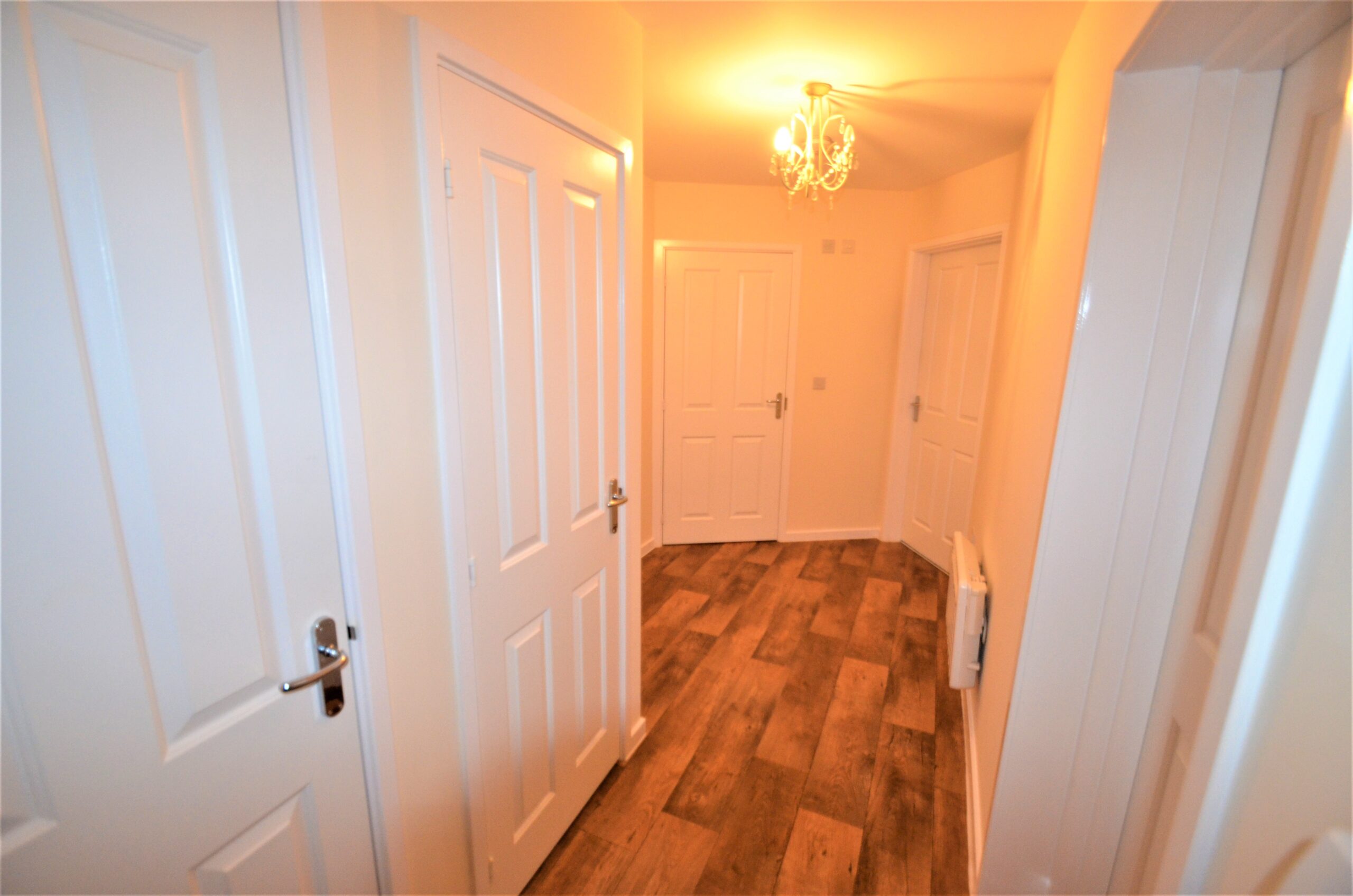 Located on the second floor, the apartment welcomes you into a spacious entrance hallway laid with wood-effect laminate flooring, complete with two generous storage cupboards that offer excellent practical space for coats, cleaning equipment or additional household items. Pendant light fittings illuminate the hallway and an electric storage heater ensures a warm and comfortable entrance.